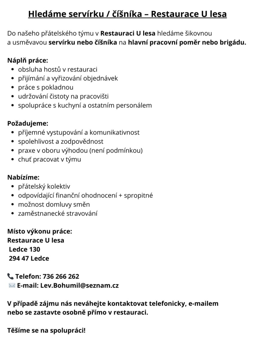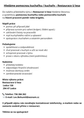 Ředitelka MŠ Ledce hledá od 24.11.2025 kuchařku na zástup za nemoc. Zájemci se mohou hlásit na tel.č. 777 674 241.